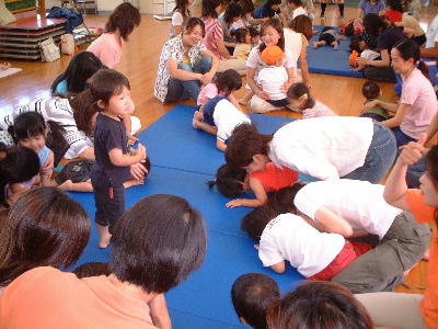始めはマットに体の一部をくっつけるゲーム。次はウサギさんに変身して、ぴょんぴょん跳び。次はアリさんに変身してゴロゴロ転がって、最後は前転に挑戦しました。体を動かす喜びと楽しさが笑顔と歓声になって、終始賑やか親子体操の時間でした。