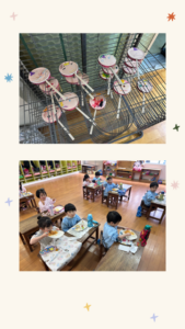今日は朝からお日様のご機嫌が斜めな様子で外遊びができません(´;ω;`) 年少さん、満3歳児さんは保護者家庭から提供いただいた廃材を利用して【でんでん太鼓】を製作しましたぁ~( ´艸`) 製作した作品が乾燥するまで、乾燥棚で一時保管して、後日お家に持って帰るので、楽しみにしていてくださいね♪